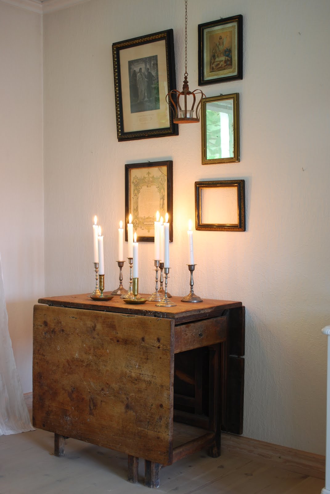Jag tycker att det är så mysigt att tända ljus på kvällen. Ovanför slagbordet hamnade min samling av gamla tavlor och ramar.Samlingen är under uppbyggnad.Tavlorna ska egentligen inte vara där, men i väntan på nya snygga väggar så måste man ju ha det trivsamt runt sig, eller hur!