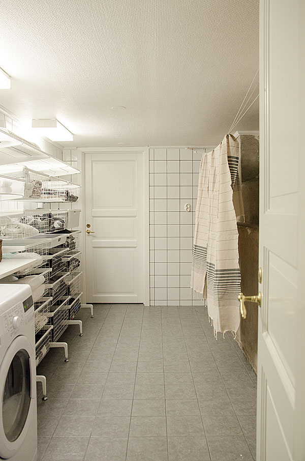 | Ovanför smutstvättkorgarna,tvättmaskinen och avfuktaren finns en praktisk bänk där man kan vika tvätt. |