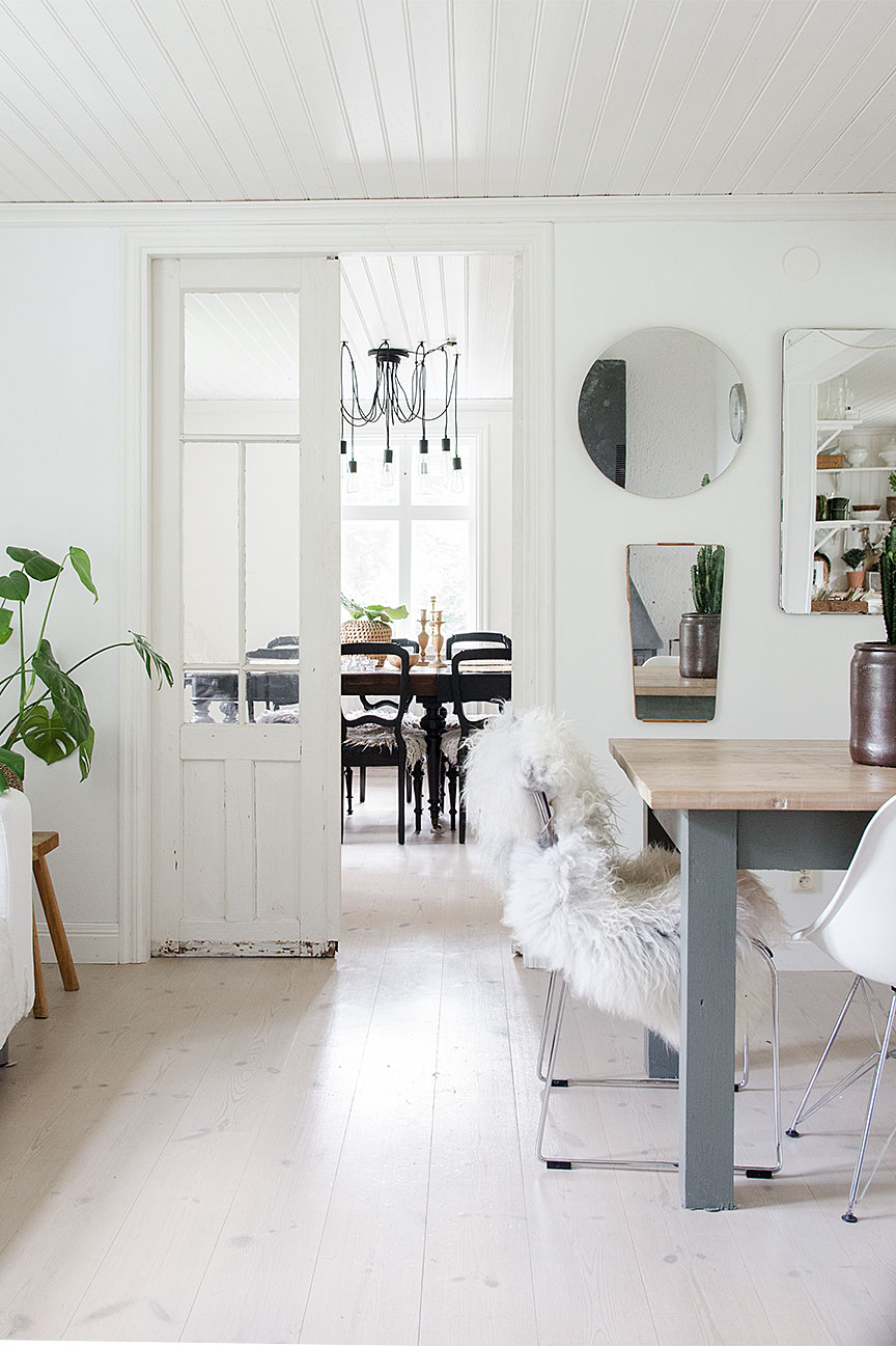 | Lampa till vänster är i från Markslöjd , soffa blocktfynd, bord hemmagjort. Svart bord, blocketfynd, stolar runt det svarta bordet, Loppisfynd Lampa över matbordet i köket och i vardagsrummet är i från Glöddesign |
