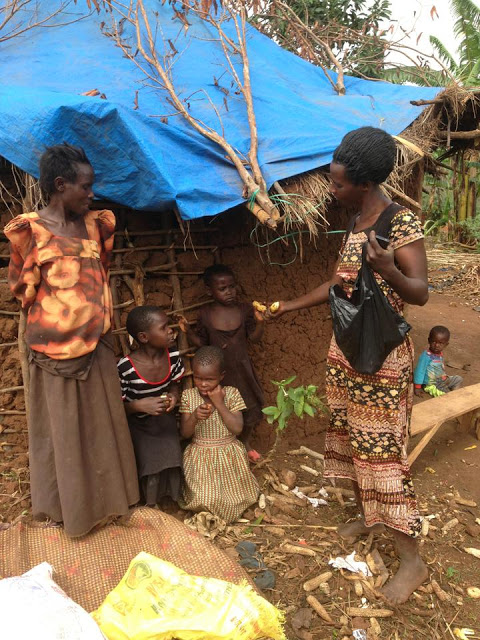 Vi känner henne, vet att hon är lika fattig och kämpar för sina barn. Vi gav henne några bananer till sig och barnen men när vi kom fram till den fattiga familjen, även där en ensamstående mamma med 3 barn som bor i en trasig lerhydda, gav vår vän vidare de bananer hon själv fått en stund tidigare.