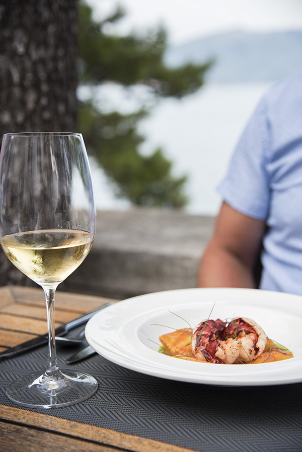 Min förrättt – Kings scallops serverades med Black truffle, pancenta och corn. Alltså det var helt otroligt gott. Jag kan ha lite svårt för tryffel, speciellt om man äter det på en restaurang som inte riktigt kan sin sak. Men eftersom Lešić Dimitri är med i Michelin guiden så var det ingen tvekan som att jag skulle våga välja denna rätt, och det var verkligen en fullträff. Till min förrätt drack jag ett vin som är tillverkat på druvsorten – Posip grape. Michaels vin var väldigt gott med, tillverkat av druvsorten GRK GRAPE, som bara växer här på ön. Det är alltid oerhört roligt att testa lokala viner och få äta nyfångad seafodd från havet där man bor.